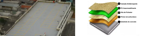 A estrutura do PU garantem aderência e impermeabilidade, além de ser livre de solventes. Ele realiza uma impermeabilização em:
