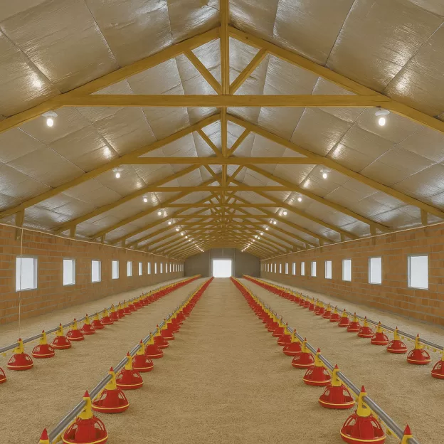 - Isolantes reflexivos (manta de alumínio): Refletem a radiação térmica e ajudam a reduzir o calor no interior das granjas durante os meses mais quentes.